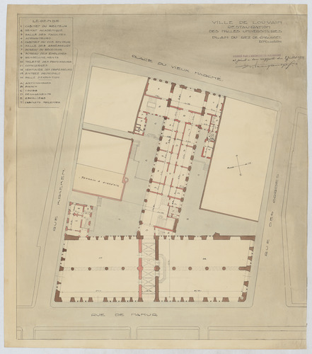 Opschrift: Ville de Louvain. Restauration des halles universitaires. Omschrijving plan: plattegrond niveau 0 Datum KCML: deze informatie wordt niet vermeld op het archiefstuk Archiefnummer: B0591