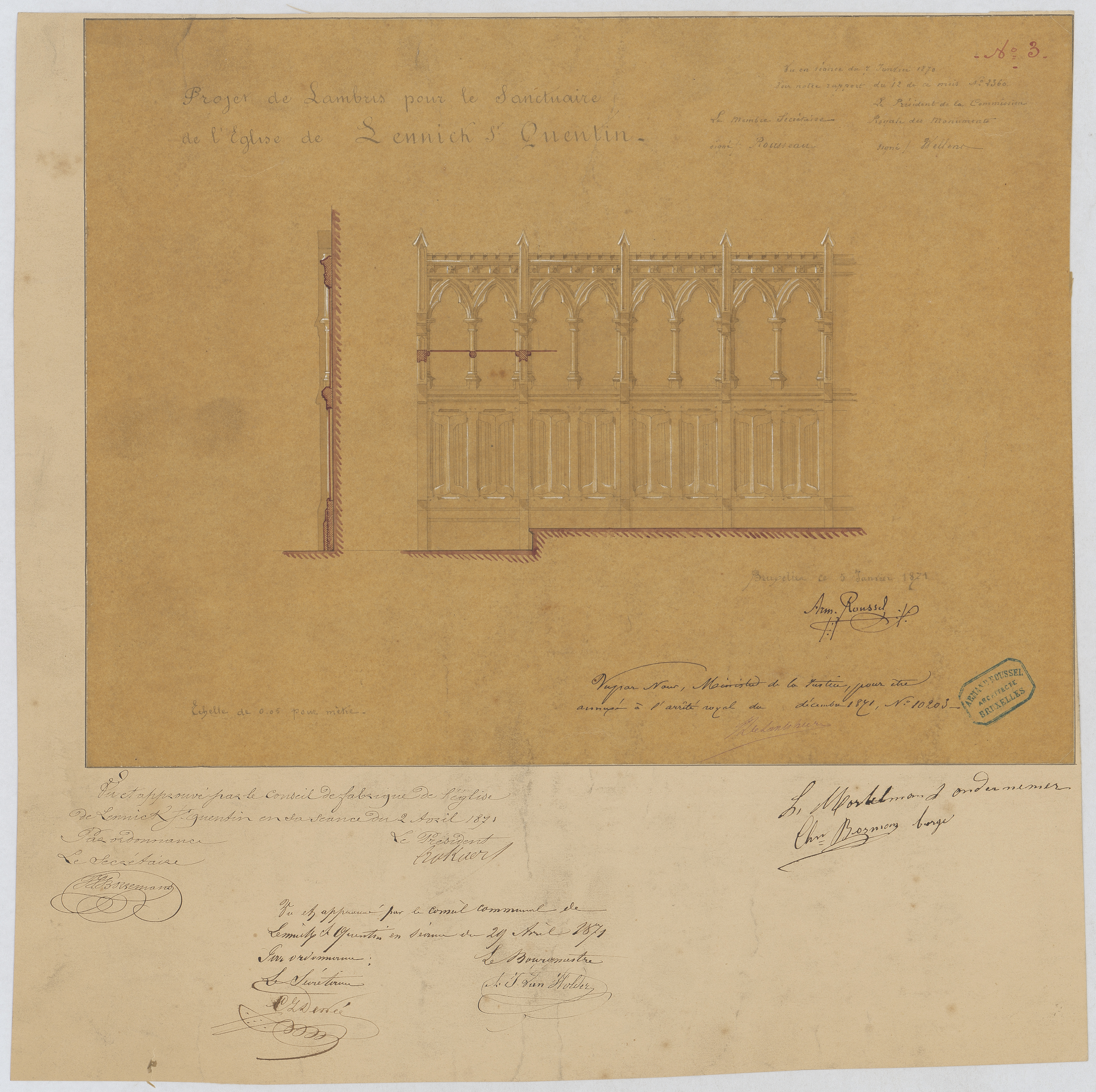 Opschrift: Projet de lambris pour le sanctuaire de l'Eglise de Lennick St. Quentin. Omschrijving plan: aanzicht en doorsnede lambrizering Datum KCML: 07/01/1871 Archiefnummer: B0504