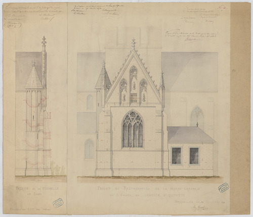 Opschrift: Projet de Restauration de la façade latérale de l'Eglise de Lennick St. Quentin. Omschrijving plan: opstand zijgevel 1 Datum KCML: 31/12/1870 Archiefnummer: B0500