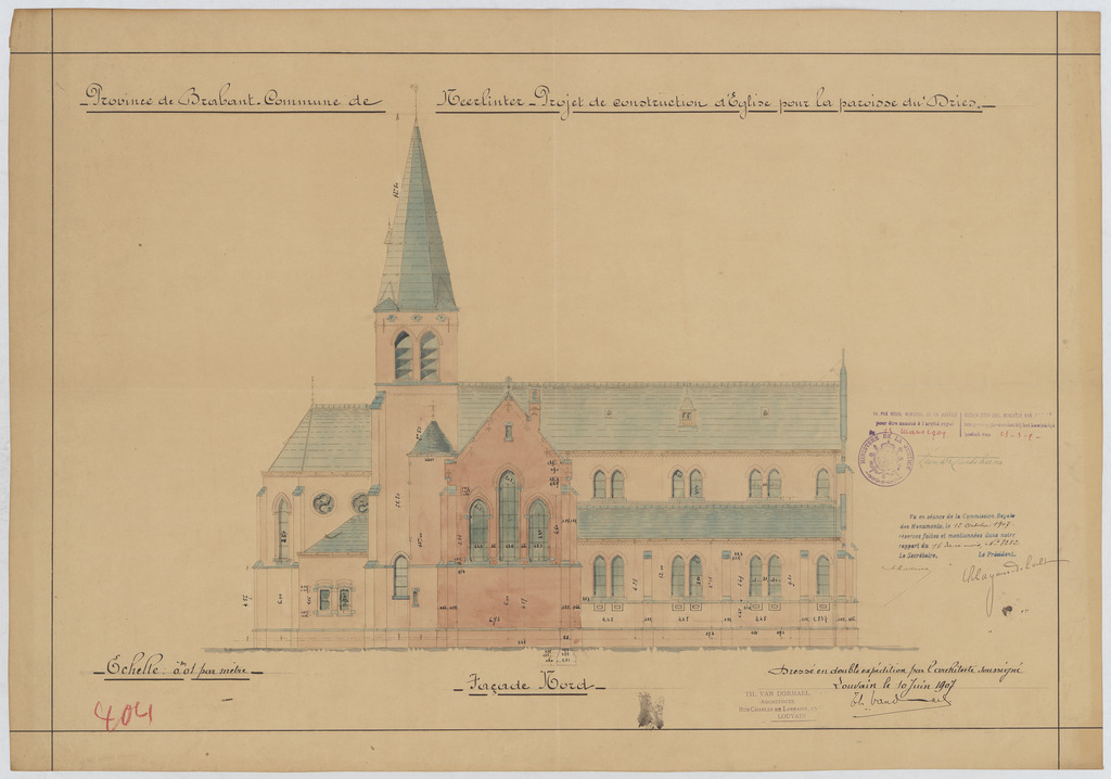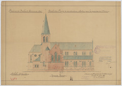 Opschrift: Province de Brabant. Commune de Neerlinter. Projet de construction d'Eglise pour la Paroisse du Dries. Omschrijving plan: opstand N-gevel Datum KCML: 12/10/1907 Archiefnummer: B0658