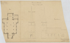 Opschrift: Province de Brabant. Arrondissement de Louvain. Commune de Binkom. Dessins de l'église actuelle. Omschrijving plan: plattegrond niveau 0, opstand voor-en zijgevel Datum KCML: deze informatie wordt niet vermeld op het archiefstuk Archiefnummer: B0671 Ontwerper: Van Arenbergh, voornaam onbekend