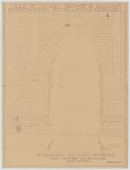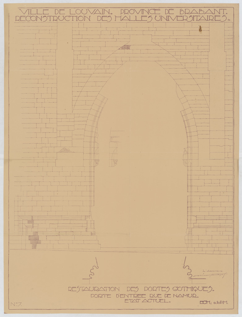 Opschrift: Ville de Louvain. Province de Brabant. Reconstruction des halles universitaires. Restauration des portes gothiques. Porte d'entrée rue de Namur. Etat actuel. Omschrijving plan: opstand poort Naamsestraat Datum KCML: deze informatie wordt niet vermeld op het archiefstuk Archiefnummer: B0608