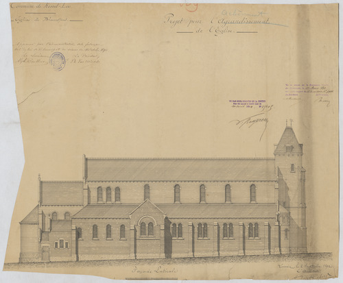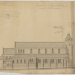 Opschrift: Commune de Kessel-Loo. Eglise de Blauwput. Projet pour l'agrandissement de l'Eglise. Omschrijving plan: opstand zijgevel 1 Datum KCML: 11/03/1893 Archiefnummer: B0639