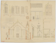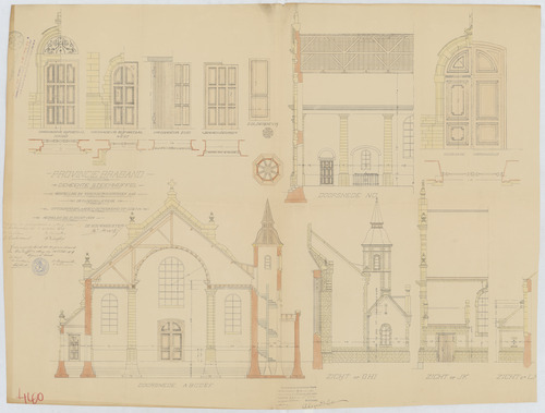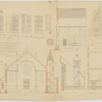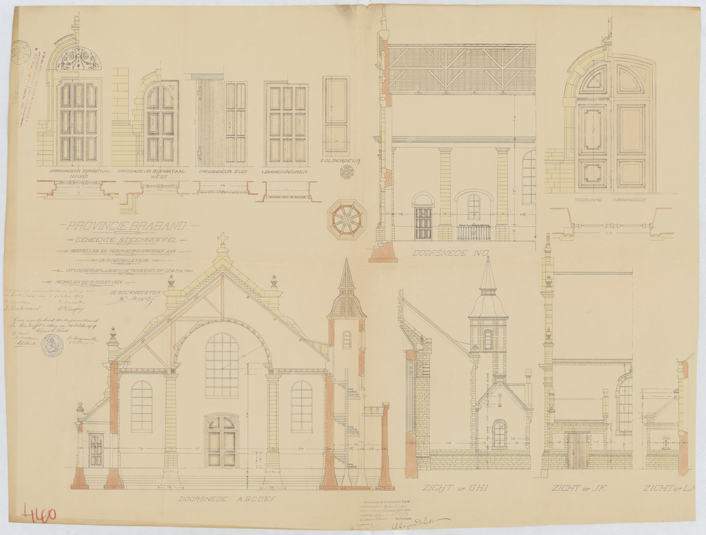 Opschrift: Provincie Brabant. Gemeente Steenhuffel. Herstelling en vergrootingswerken aan de parochiale kerk. Omschrijving plan: dwarsdoorsnede, aanzicht en plattegronden portalen Datum KCML: 10/04/1909 Archiefnummer: B0668