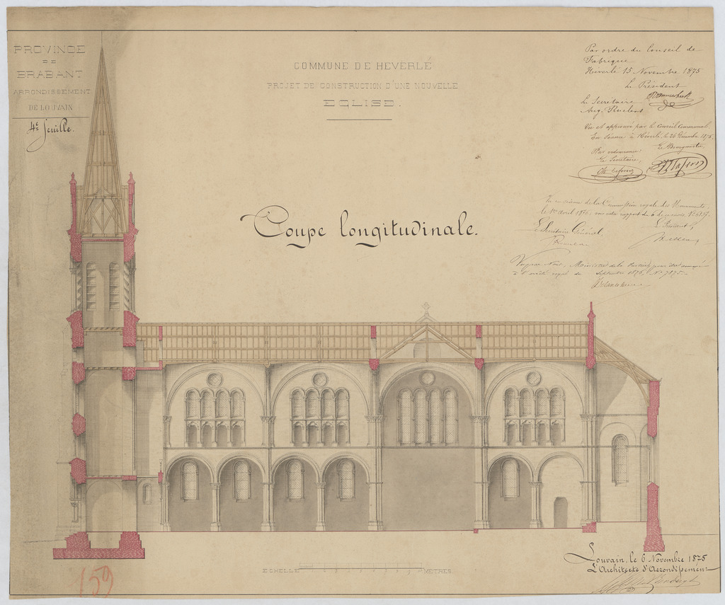 Opschrift: Province de Brabant. Arrondissement de Louvain. Commune de Heverlee. Projet de construction d'une nouvelle église. Omschrijving plan: langsdoorsnede Datum KCML: 01/04/1876 Archiefnummer: B0626