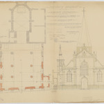 Opschrift: Provincie Brabant. Gemeente Steenhuffel. Herstelling en vergrootingswerken aan de parochiale kerk. Omschrijving plan: plattegrond niveau 0, opstand voorgevel Datum KCML: 10/04/1909 Archiefnummer: B0666