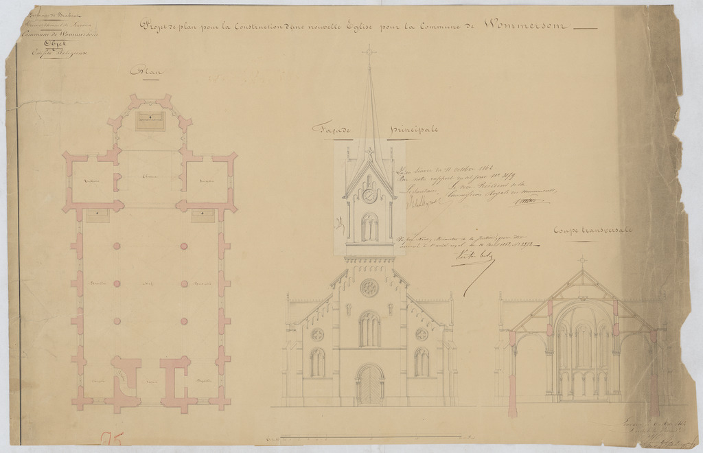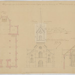 Opschrift: Projet de plan pour la Construction d'une nouvelle Eglise pour la Commune de Wommersom. Omschrijving plan: plattegrond niveau 0, opstand voorgevel, dwarsdoorsnede (aangepast ontwerp) Datum KCML: 11/10/1892 Archiefnummer: B0663_01