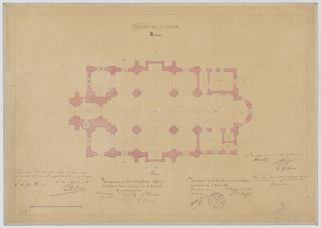 Opschrift: Eglise de Linden. Brabant. Omschrijving plan: plattegrond niveau 0 Datum KCML: 10/04/1875 Archiefnummer: B0676