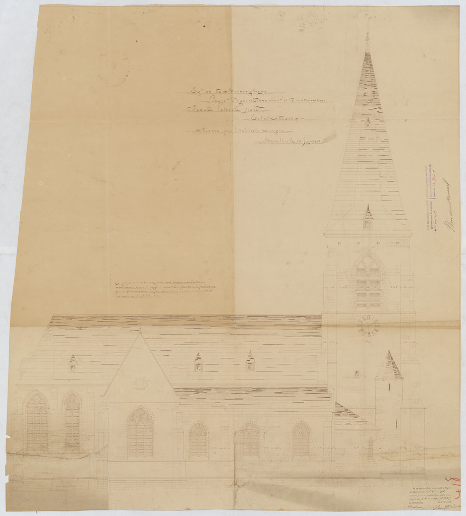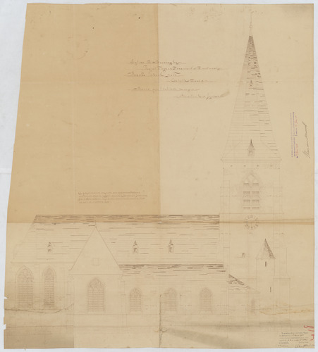 Opschrift: Eglise de Brusseghem. Projet de'agrandissement et de restauration. Omschrijving plan: opstand zijgevel 1 Datum KCML: 5-3-1904 Archiefnummer: B0746