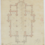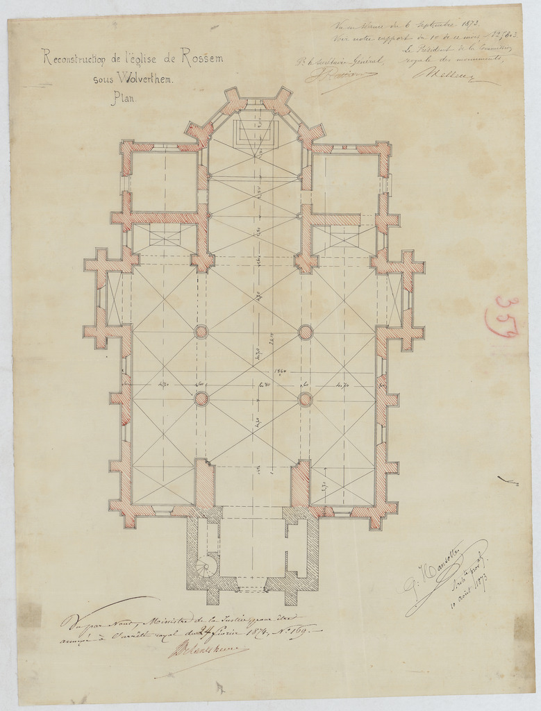 Opschrift: Reconstruction de l'église de Rossem sous Wolverthem. Omschrijving plan: plattegrond niveau 0 Datum KCML: 06/09/1873 Archiefnummer: B0738