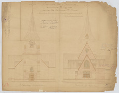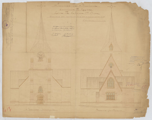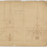 Opschrift: Province de Brabant. Commune de Meysse. Eglise de Rhode-St.-Brice. Travaux de restauration et d'agrandissement. Omschrijving plan: opstand voorgevel, opstand achtergevel Datum KCML: 21/04/1906 Archiefnummer: B0720