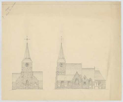 Opschrift: Province de Brabant. Commune de Meysse. Eglise de Rhode-St.-Brice. Travaux de restauration et d'agrandissement. Omschrijving plan: dwarsdoorsnede Datum KCML: 21/04/1906 Archiefnummer: B0725