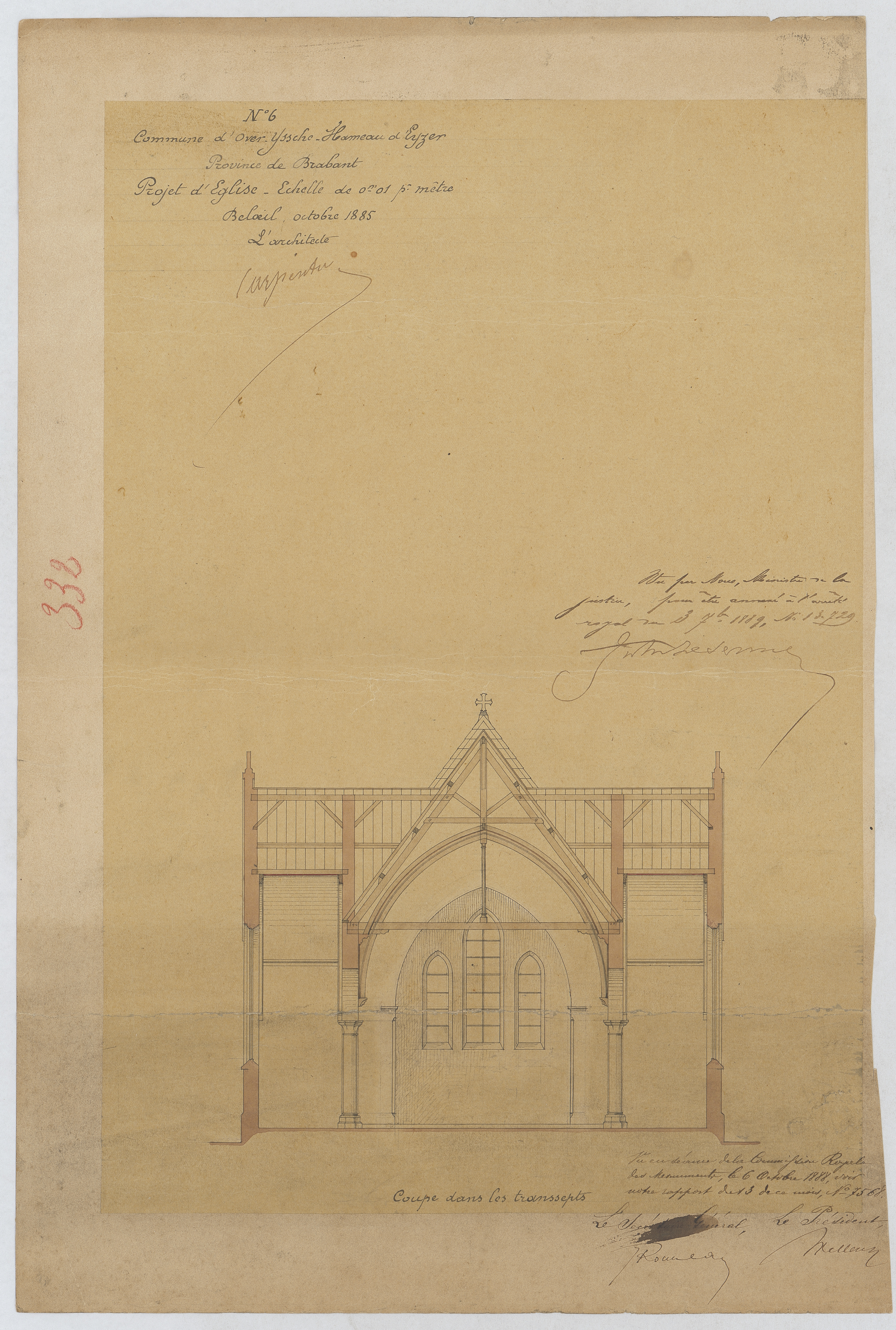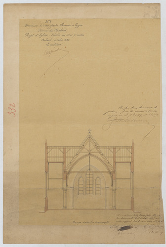 Opschrift: Commune d'Over-Yssche - Hameau d'Eyzer. Province de Brabant. Projet d'Eglise. Omschrijving plan: dwarsdoorsnede, dwarsdoorsnede naar portaal Datum KCML: 06/10/1888 Archiefnummer: B0795