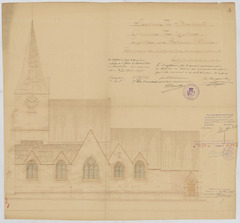 Opschrift: Province de Brabant. Commune de Meysse. Eglise de Rhode-St.-Brice. Travaux de restauration et d'agrandissement Omschrijving plan: opstand zijgevel 2 Datum KCML: 21/04/1906 Archiefnummer: B0722