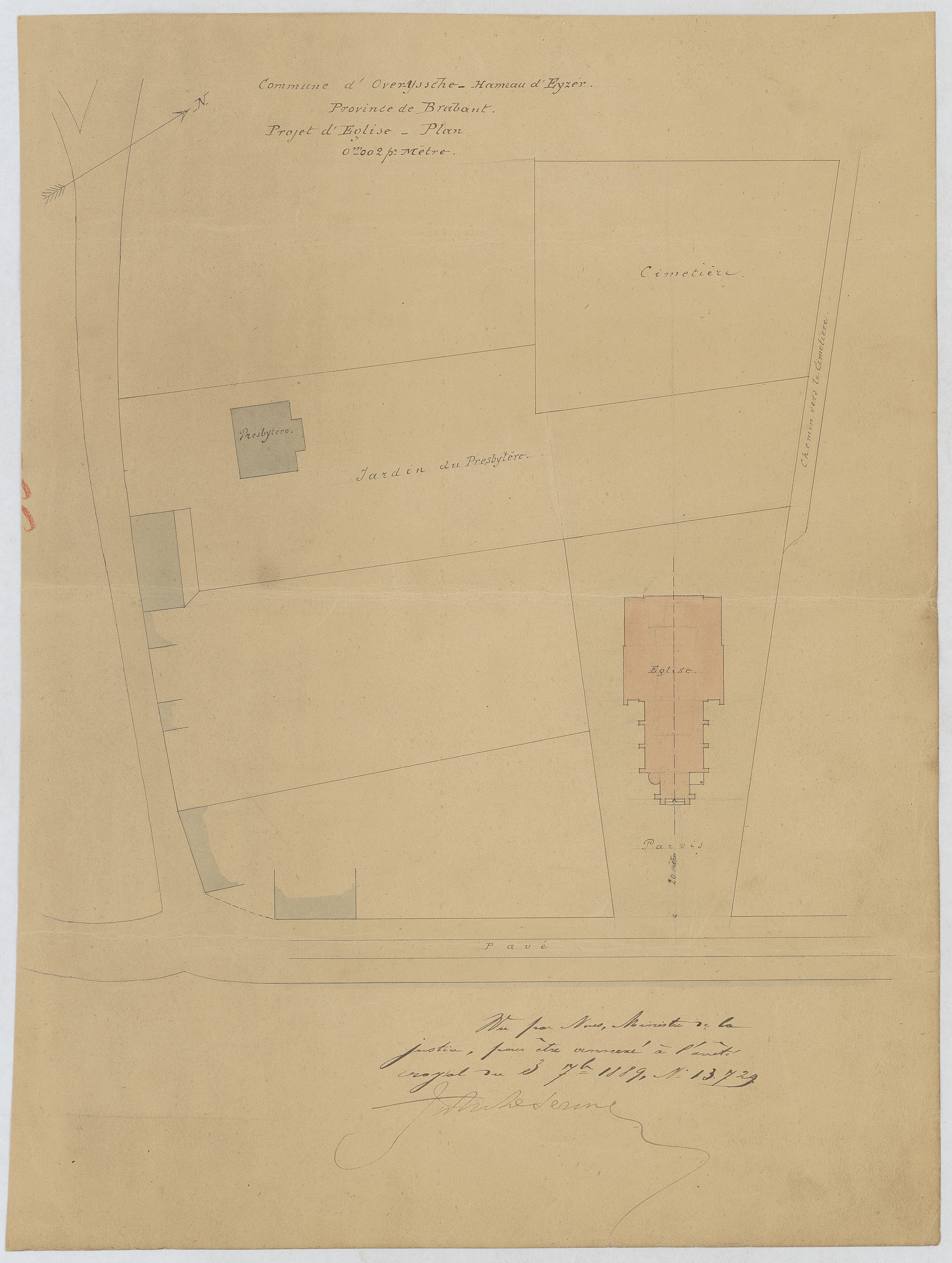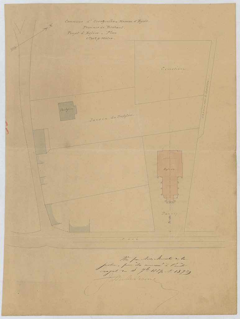 Opschrift: Commune d'Overyssche - Hameau d'Eyzer. Province de Brabant. Projet d'Eglise - Plan. Omschrijving plan: situatieplan Datum KCML: deze informatie wordt niet vermeld op het archiefstuk Archiefnummer: B0796