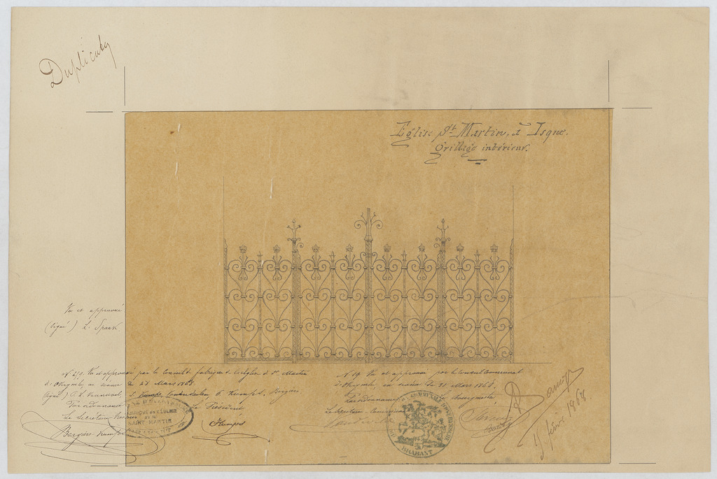 Opschrift: Eglise St. Martin à Isques. Ornementation de la porte d'entrée. Omschrijving plan: aanzicht inkomdeur Datum KCML: deze informatie wordt niet vermeld op het archiefstuk Archiefnummer: B0774