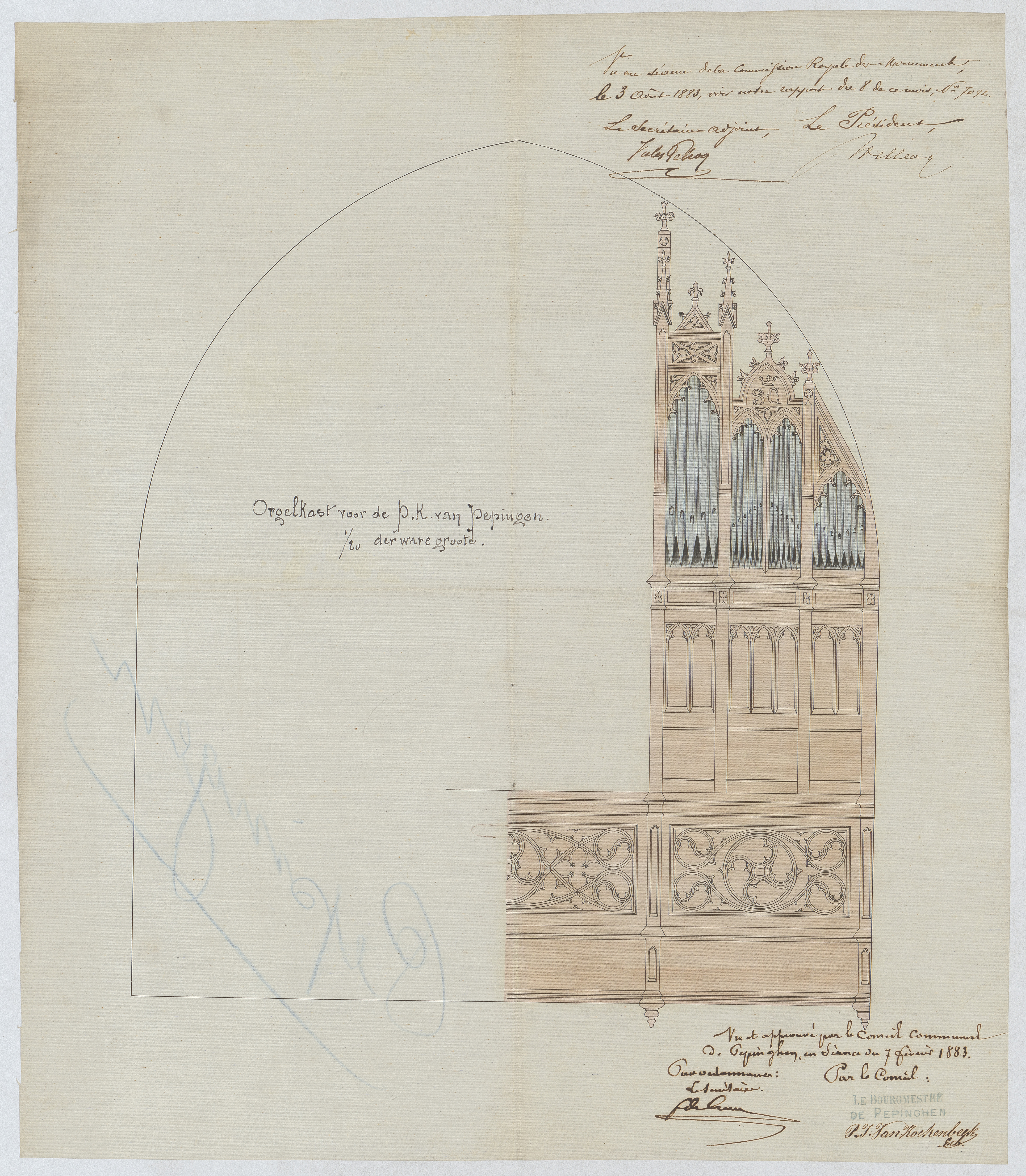 Opschrift: Orgelkast voor de P.K. van Pepingen. Omschrijving plan: aanzicht orgel Datum KCML: 03/08/1883 Archiefnummer: B0800