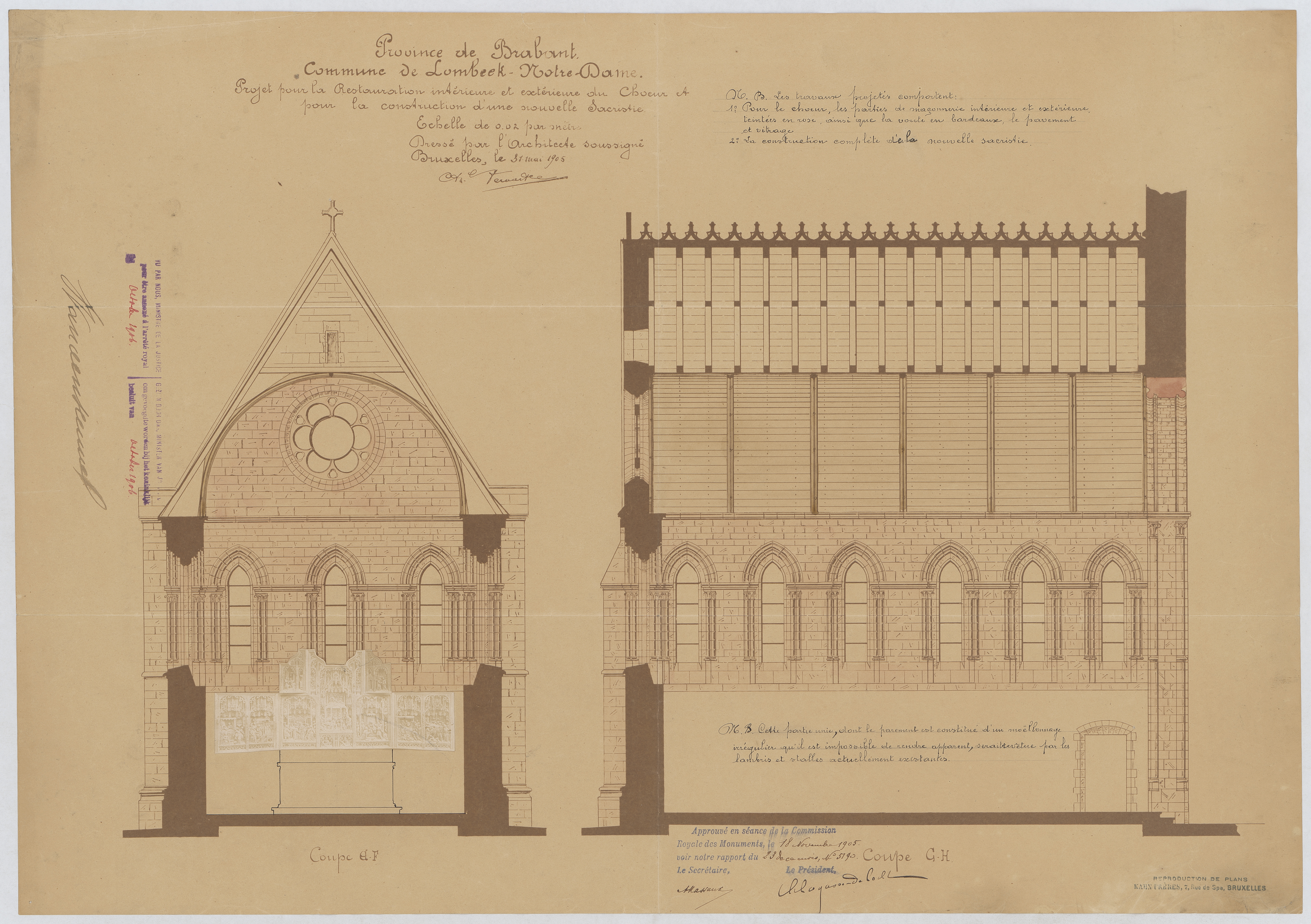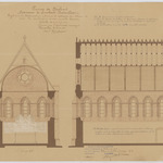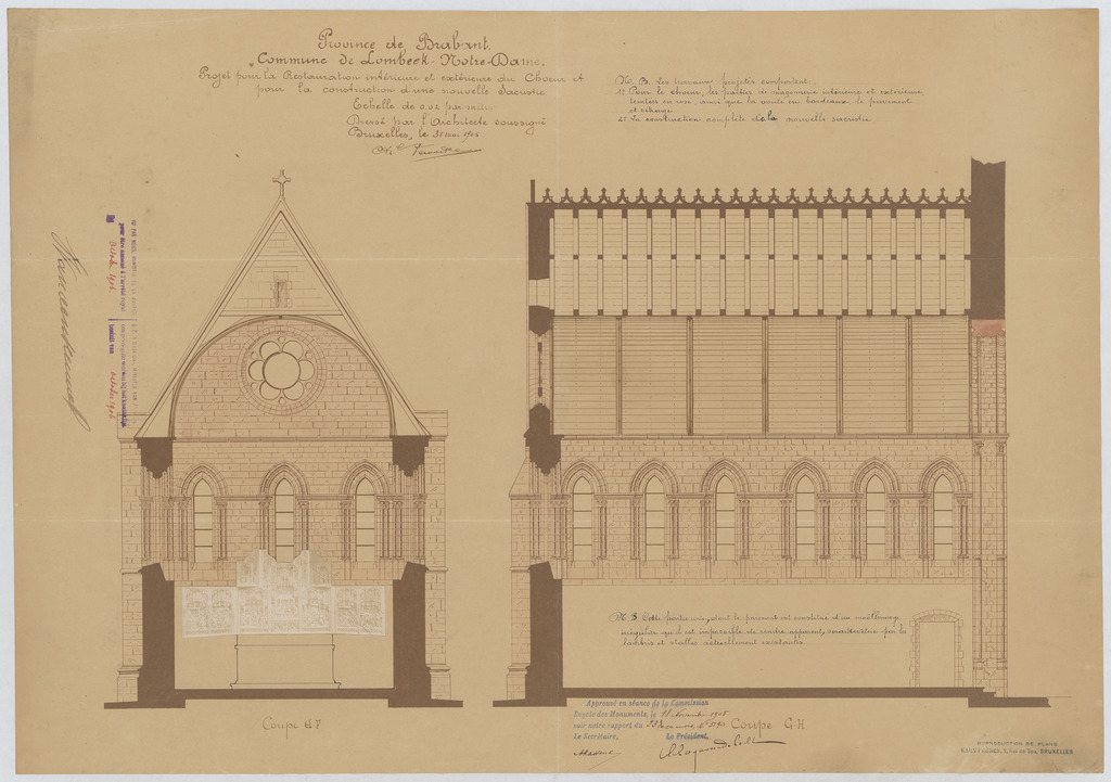 Opschrift: Province de Brabant. Commune de Lombeek-Notre Dame. Projet pour la restauration intérieure et exterieur du choeur et pour la construction d'une nouvelle Sacristie. Omschrijving plan: langsdoorsnede, dwarsdoorsnede Datum KCML: 18/11/1905 Archiefnummer: B0823
