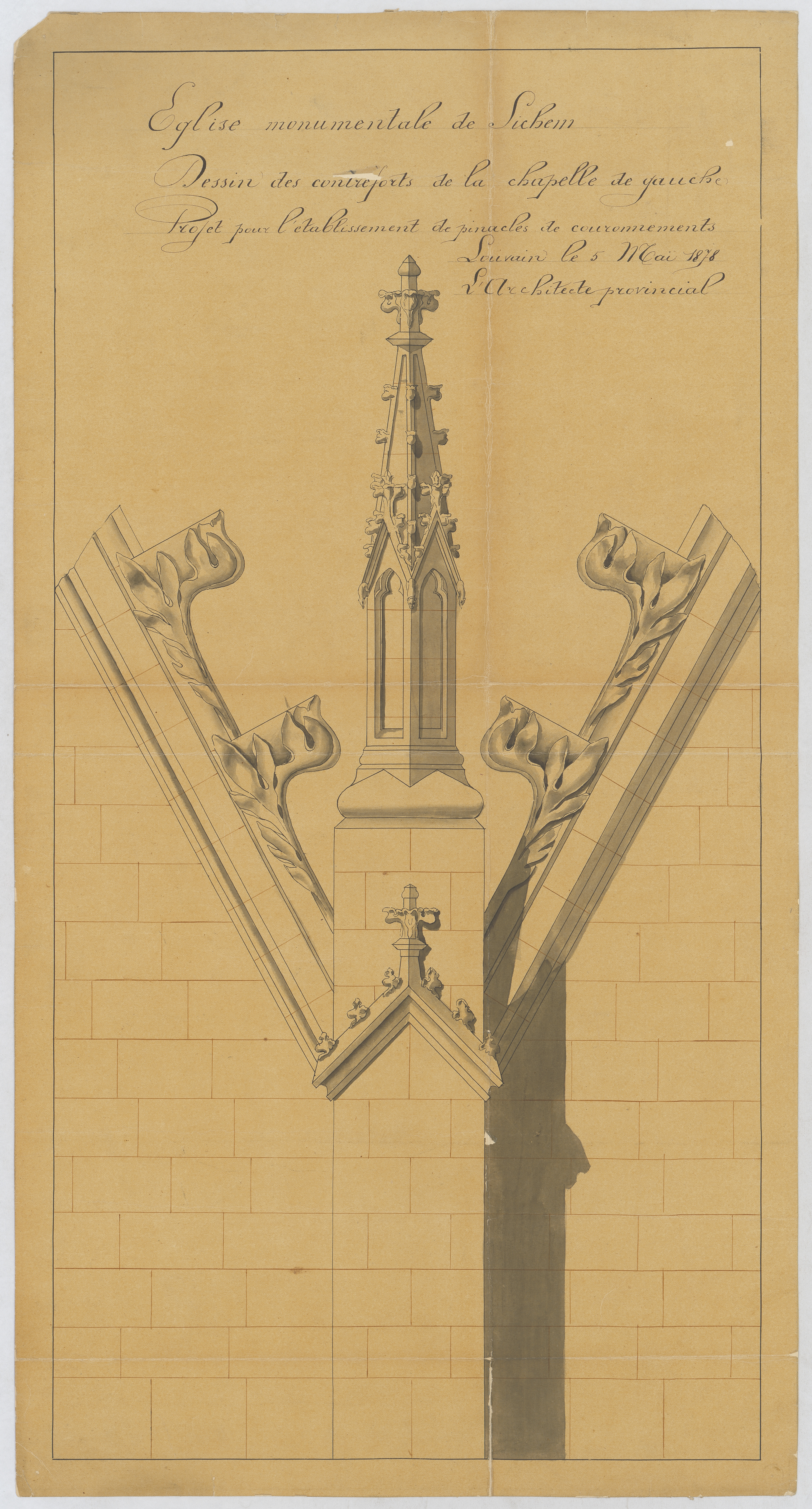 Opschrift: Eglise monumentale de Sichem . Dessin des contreforts de la chapelle de gauche. Projet pour l'établissement de pinacles de couronnement. Omschrijving plan: pinakel Datum KCML: deze informatie wordt niet vermeld op het archiefstuk Archiefnummer: B0878