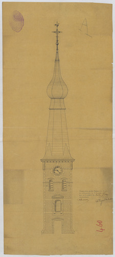 Opschrift: deze informatie wordt niet vermeld op het archiefstuk Omschrijving plan: opstand voorgevel, opstand toren Datum KCML: 28/07/1900 Archiefnummer: B0849