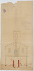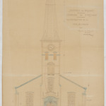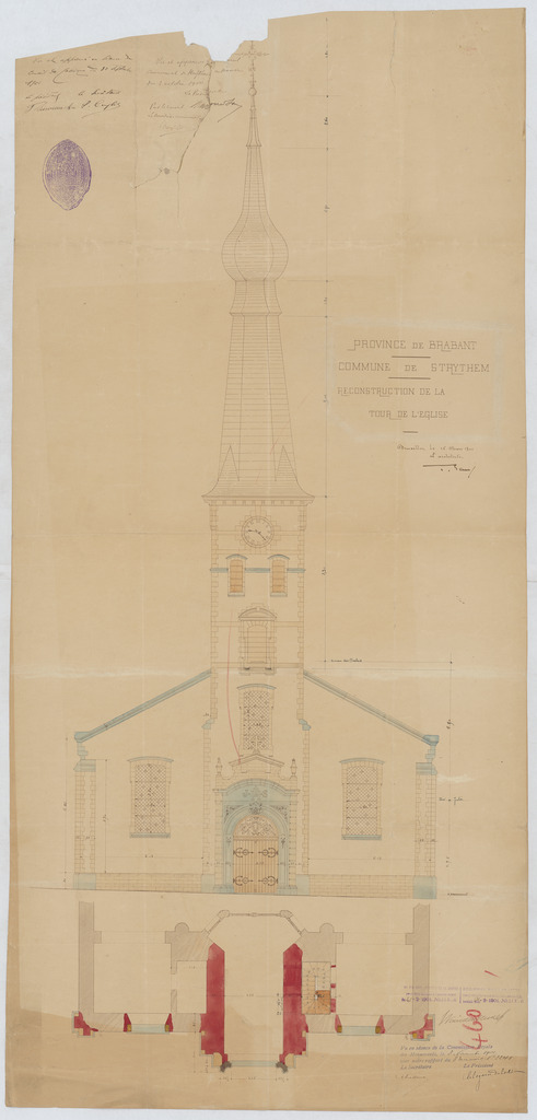 Opschrift: Province de Brabant. Commune de Strythem. Reconstruction de la tour de l'église. Omschrijving plan: opstand voorgevel Datum KCML: 30/11/1900 Archiefnummer: B0850