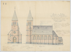 Opschrift: Province de Brabant. Commune d'Oudenaeken. Construction d'une nouvelle église paroissiale et d'une clôture de cimetière en remplacement d'une ancienne à démolir. Omschrijving plan: opstand W-gevel, opstand Z-gevel Datum KCML: 30/01/1909 Archiefnummer: B0889