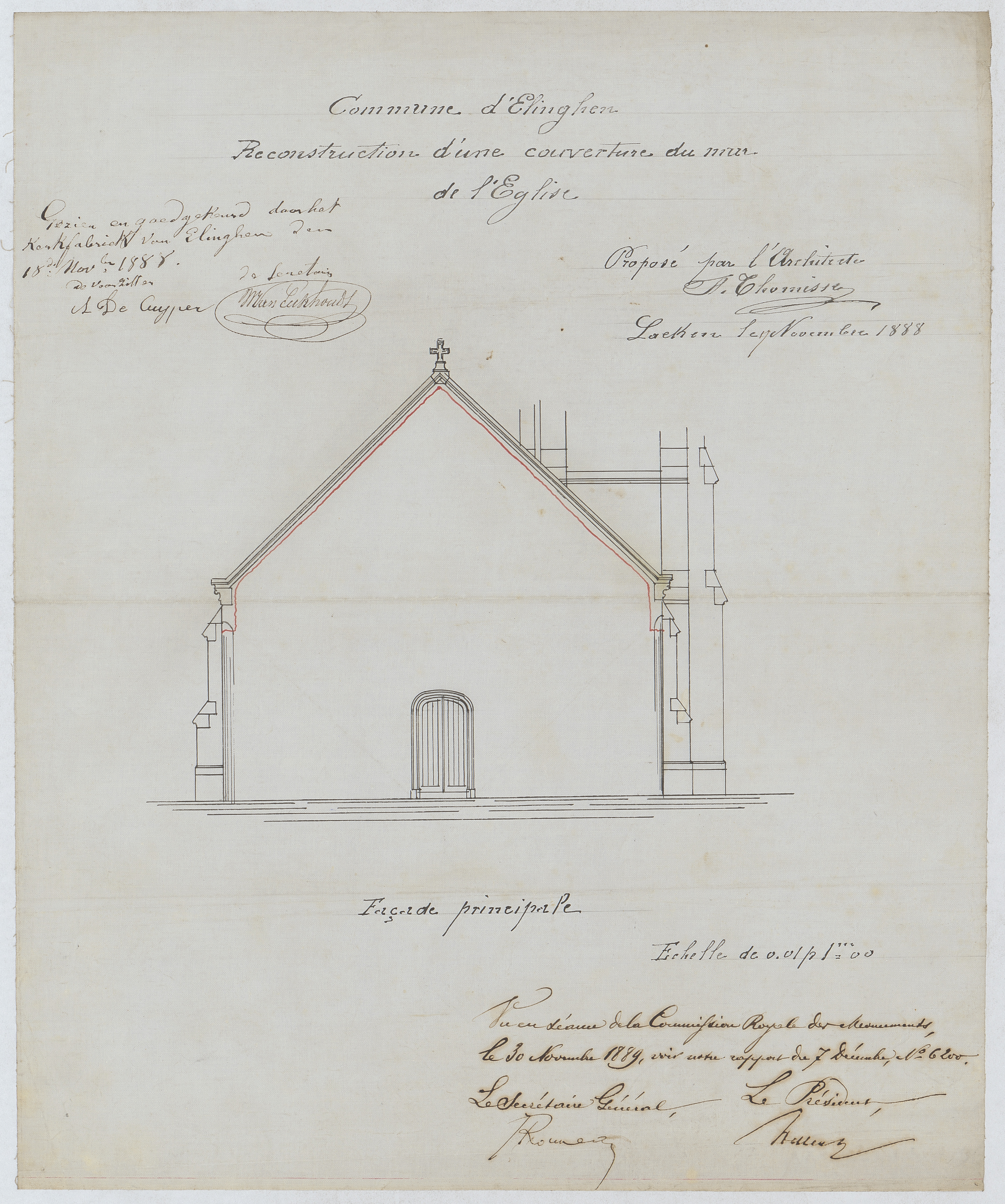 Opschrift: Commune de Elinghen. Reconstruction d'une couverture du mur de l'Eglise. Omschrijving plan: opstand voorgevel Datum KCML: 30/11/1889 Archiefnummer: B0807