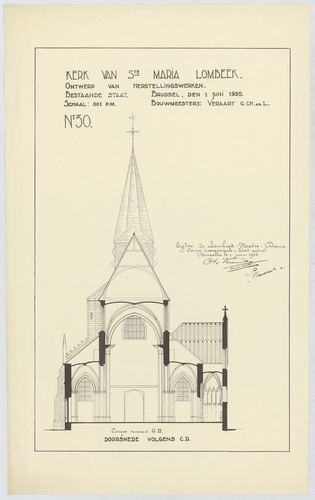 Opschrift: Kerk van Ste Maria Lombeek. Ontwerp van herstellings werken. Bestaande staat. Omschrijving plan: dwarsdoorsnede, dwarsdoorsnede naar portaal Datum KCML: deze informatie wordt niet vermeld op het archiefstuk Archiefnummer: B0828