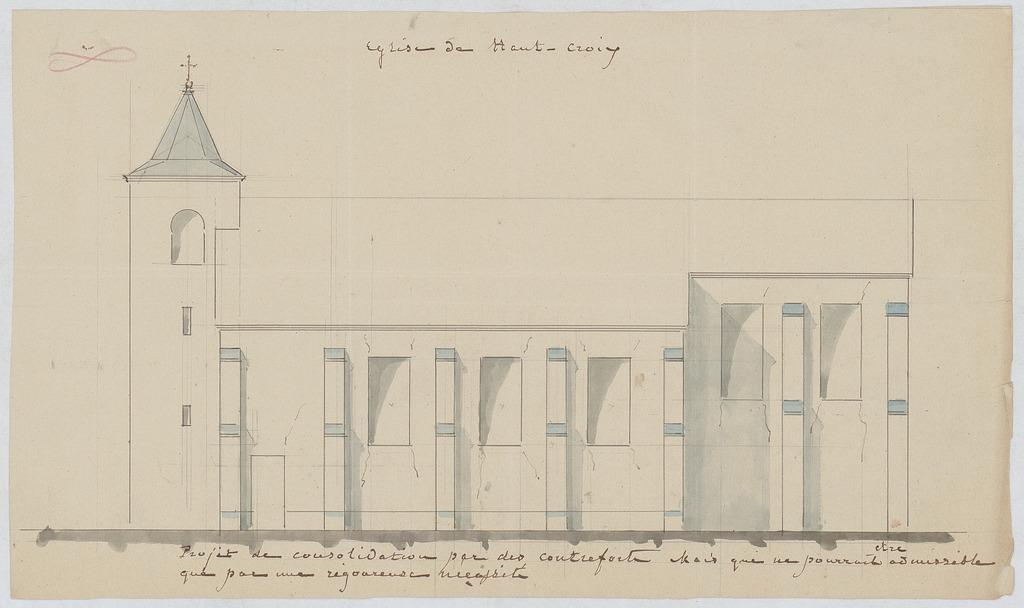 Opschrift: Croquis de la façade latérale de l'Eglise de Haut-Croix. Omschrijving plan: opstand zijgevel 1, situatieplan Datum KCML: deze informatie wordt niet vermeld op het archiefstuk Archiefnummer: B0818