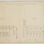 Opschrift: Province de Brabant. Arrondissement de Louvain. Projet de plan pour la construction d'une église à Schoonderbueken sous Montaigu. Omschrijving plan: opstand zijgevel 1, langsdoorsnede Datum KCML: 07/07/1870 Archiefnummer: B0856