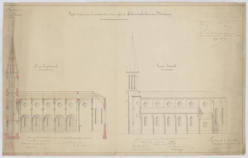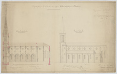 Opschrift: Province de Brabant. Arrondissement de Louvain. Projet de plan pour la construction d'une église à Schoonderbueken sous Montaigu. Omschrijving plan: opstand zijgevel 1, langsdoorsnede Datum KCML: 07/07/1870 Archiefnummer: B0856