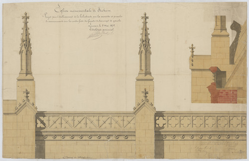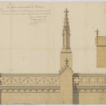 Opschrift: Eglise monumentale de Sichem . Projet pour l'établissement de la balustrade sur la corniche et pinacles de couronnements sur les contreforts des façades du transept de gauche. Omschrijving plan: balustrade, doorsnede balustrade Datum KCML: deze informatie wordt niet vermeld op het archiefstuk Archiefnummer: B0881