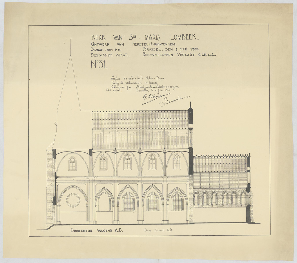 Opschrift: Kerk van Ste Maria Lombeek. Ontwerp van herstellings werken. Bestaande staat. Omschrijving plan: langsdoorsnede Datum KCML: deze informatie wordt niet vermeld op het archiefstuk Archiefnummer: B0830