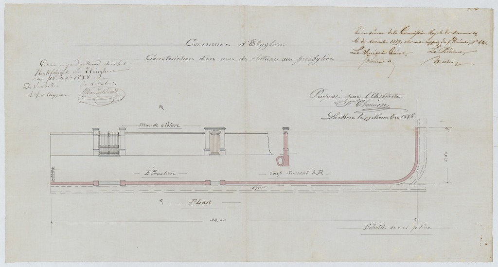 Opschrift: Commune d'Elinghen. Construction d'un mur de clôture au presbytère. Omschrijving plan: plattegrond, aanzicht en doorsnede afsluitmuur Datum KCML: 30/11/1889 Archiefnummer: B0809