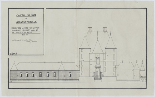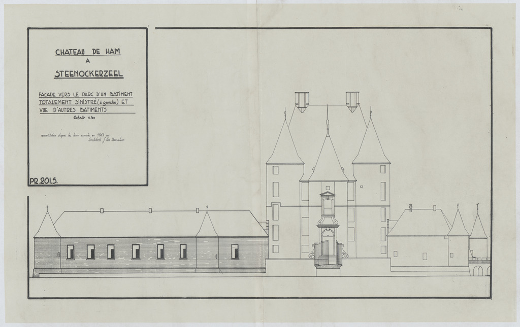 Opschrift: Château de Ham à Steenockerzeel. Façade vers le parc d'un batiment totalement sinistré (à gauche) et vue d'autres bâtiments. Reconstruction d'après les levés exécutés en 1943 par l'architecte J. van Doorslaere. Omschrijving plan: opstand voorgevel Datum KCML: deze informatie wordt niet vermeld op het archiefstuk Archiefnummer: B0919