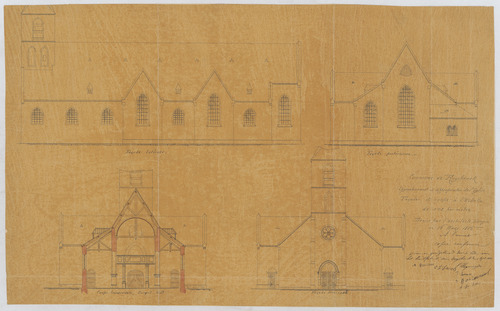 Opschrift: Commune de Ruysbroeck. Agrandissement et appropriations de l'Eglise. Omschrijving plan: opstand voorgevel, opstand achter- en zijgevel, dwrasdoorsnede naar portaal Datum KCML: deze informatie wordt niet vermeld op het archiefstuk Archiefnummer: B0901