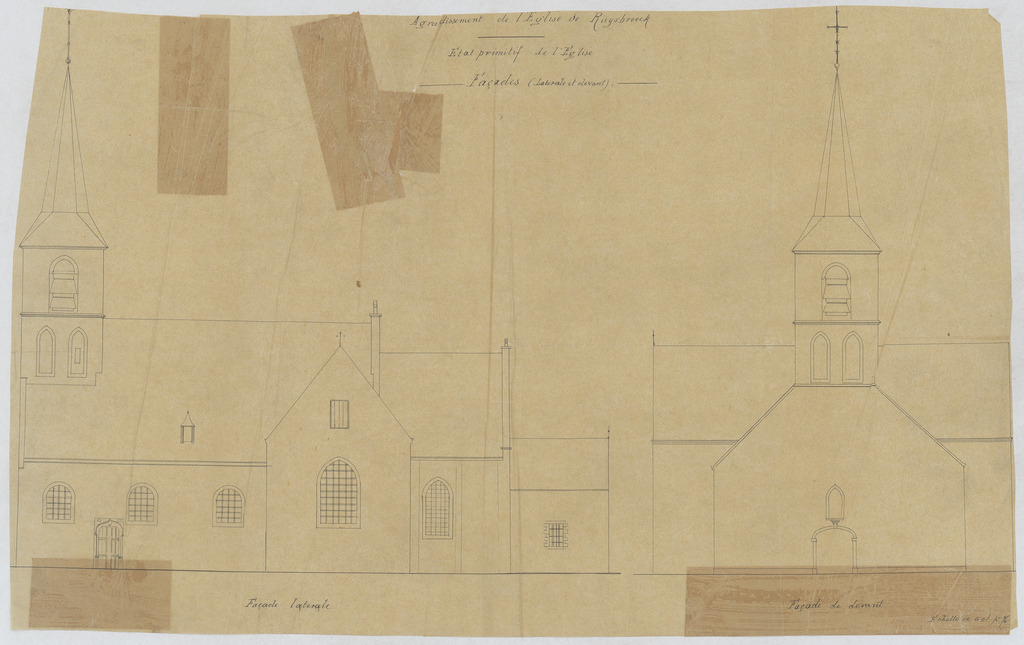 Opschrift: Agrandissement de l'Eglise de Ruysbroeck. Etat primitif de l'Eglise. Omschrijving plan: opstand voorgevel, opstand zijgevel Datum KCML: deze informatie wordt niet vermeld op het archiefstuk Archiefnummer: B0910