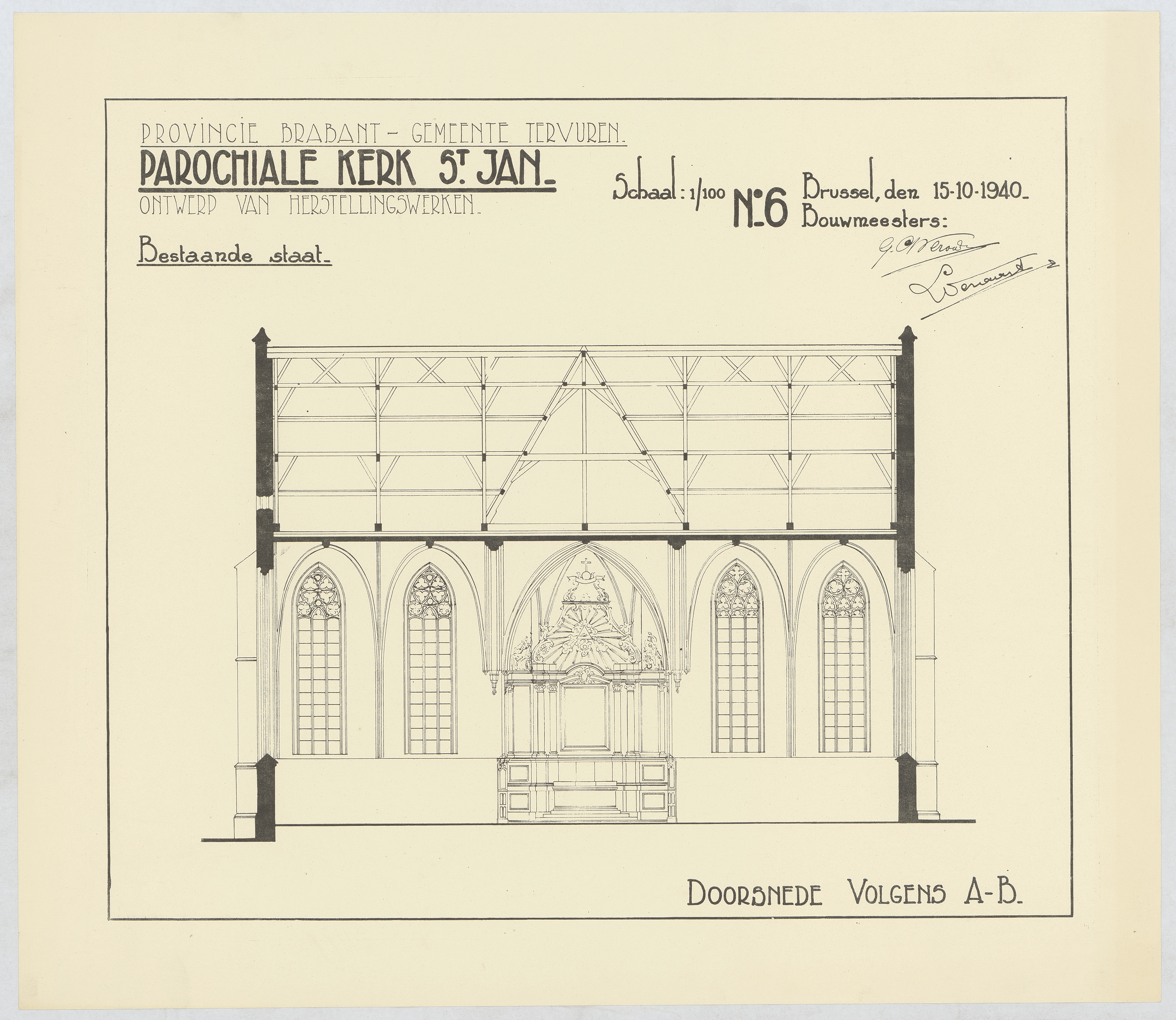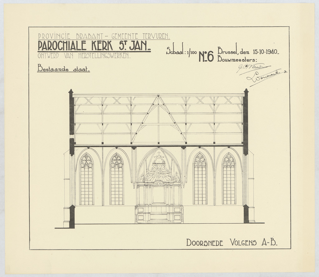 Opschrift: Provincie Brabant - Gemeente Tervuren. Parochiale kerk St.-Jan. Ontwerp van herstellingswerken. Bestaande staat. Omschrijving plan: dwarsdoorsnede, dwarsdoorsnede naar koor Datum KCML: deze informatie wordt niet vermeld op het archiefstuk Archiefnummer: B0996
