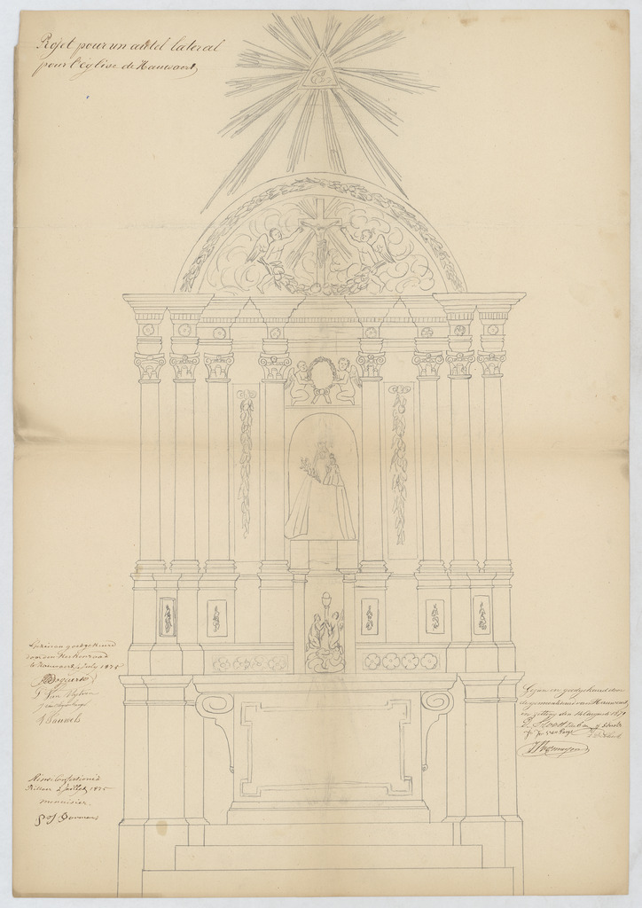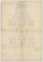 Opschrift: Projet pour un autel lateral pour l'église de Hauwaert. Omschrijving plan: aanzicht zijaltaar Datum KCML: 01/01/1875 Archiefnummer: B1028 Ontwerper: Bormans, P.J. (uitvoerder)