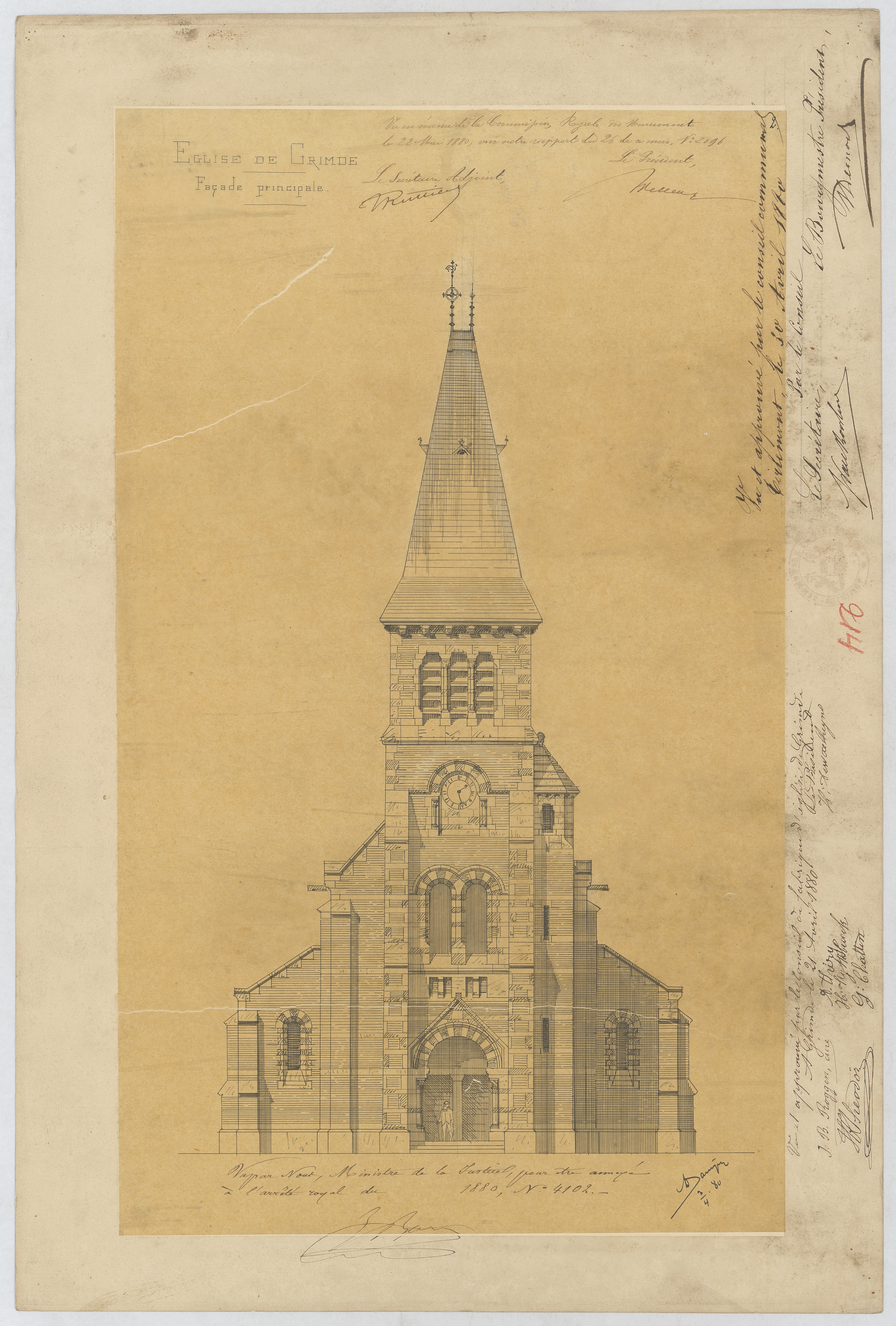 Opschrift: Eglise de Grimde. Omschrijving plan: opstand voorgevel Datum KCML: 22/05/1880 Archiefnummer: B1067