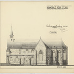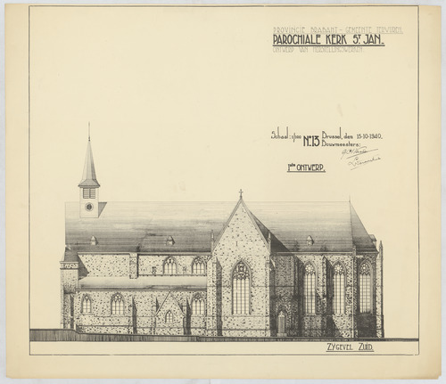 Opschrift: Provincie Brabant - Gemeente Tervuren. Parochiale kerk St.-Jan. Ontwerp van herstellingswerken. Ontwerp van herstellingswerken. Omschrijving plan: opstand Z-gevel Datum KCML: deze informatie wordt niet vermeld op het archiefstuk Archiefnummer: B1002