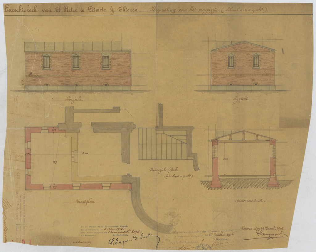 Opschrift: Parochiekerk van St. Pieter te Grimde bij Thienen. Vergrooting van het magazijn. Omschrijving plan: plattegrond niveau 0, voor-, zij- en bovenaanzicht en doorsnede magazijn Datum KCML: 3-6-1905 Archiefnummer: B1073