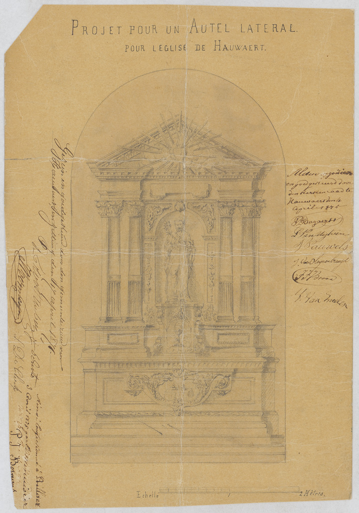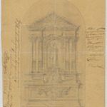 Opschrift: Projet pour un autel lateral pour l'église de Hauwaert. Omschrijving plan: aanzicht zijaltaar Datum KCML: deze informatie wordt niet vermeld op het archiefstuk Archiefnummer: B1030 Ontwerper: Bormans, P.J. (uitvoerder)