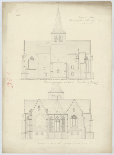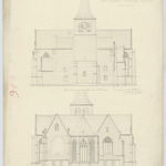Opschrift: Province du Brabant. Eglise paroissiale de St. Généviève à Oplinter. Etat actuel. Omschrijving plan: opstand O-gevel, opstand W-gevel Datum KCML: deze informatie wordt niet vermeld op het archiefstuk Archiefnummer: B1083