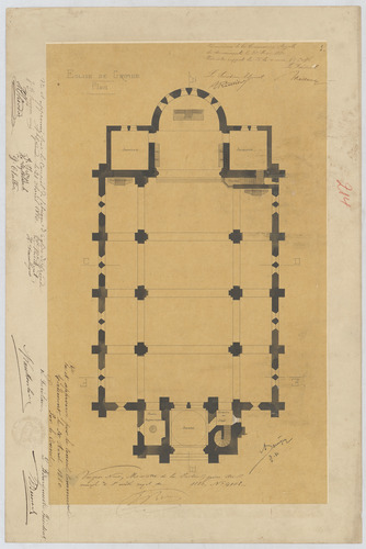 Opschrift: Eglise de Grimde. Omschrijving plan: plattegrond niveau 0 Datum KCML: 22/05/1880 Archiefnummer: B1066