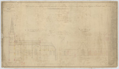 Opschrift: Province de Brabant. Arrondissement de Louvain. Commune de Thielt. Objet. Edifice Religieux. Projet de plan pour l' agrandissement et restauration avec construction d'un nouveau Clocher pour l'eglise de Thielt notre Dame. Omschrijving plan: opstand zijgevel 1, langsdoorsnede Datum KCML: 22/10/1861 Archiefnummer: B1025 Ontwerper: Van Arenbergh, voornaam onbekend