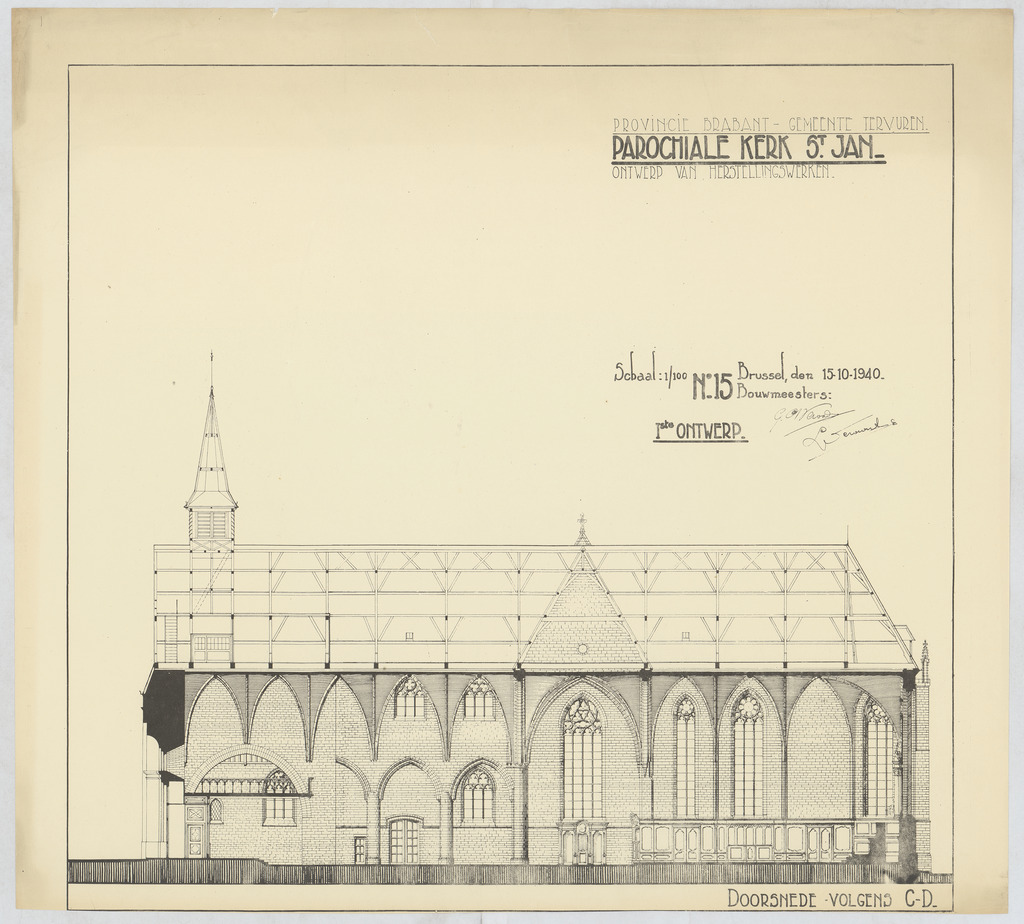 Opschrift: Provincie Brabant - Gemeente Tervuren. Parochiale kerk St.-Jan. Ontwerp van herstellingswerken. Ontwerp van herstellingswerken. Omschrijving plan: langsdoorsnede Datum KCML: deze informatie wordt niet vermeld op het archiefstuk Archiefnummer: B1004