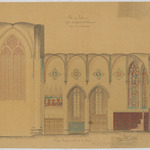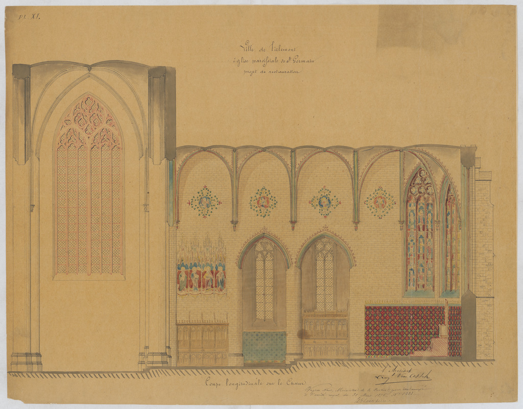 Opschrift: Ville de Tirlemont. Eglise paroissiale de St. Germain. Projet de restauration. Omschrijving plan: langsdoorsnede, langsdoorsnede koor Datum KCML: deze informatie wordt niet vermeld op het archiefstuk Archiefnummer: B1040