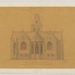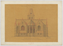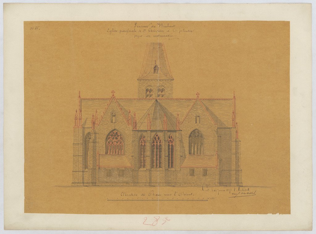 Opschrift: Province du Brabant. Eglise paroissiale de St. Généviève à Oplinter. Projet de restauration. Omschrijving plan: opstand O-gevel Datum KCML: deze informatie wordt niet vermeld op het archiefstuk Archiefnummer: B1091