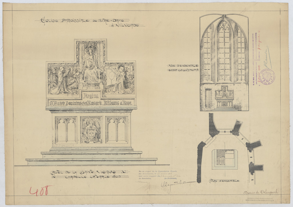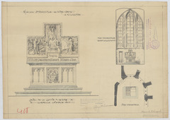 Opschrift: Eglise paroissiale de Notre-Dame à Vilvorde. Autel de la Sainte Vierge, chapelle laterale sud. Omschrijving plan: plattegrond en aanzicht altaar Datum KCML: 28/03/1908 Archiefnummer: B1106